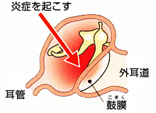 のど・鼻についた細菌やウィルスが、耳管を通って中耳に入り、炎症を起こします。大部分が「かぜ」に合併して起こります。